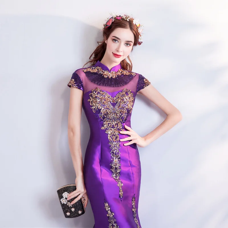 Best 2019 New Young Mother Purple Chinese Embroidery Slim Fishtail Mandarin Collar Brief Cheongsam