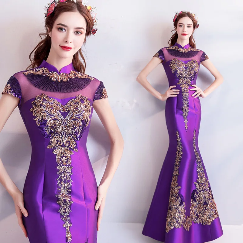 Special Product 2019 New Young Mother Purple Chinese Embroidery Slim Fishtail Mandarin Collar Brief Cheongsam