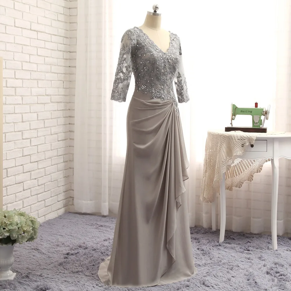 Buy Plus Size Gray 2019 Mother Of The Bride Dresses A-line 3/4 Sleeves Chiffon Lace Wedding Party Dress