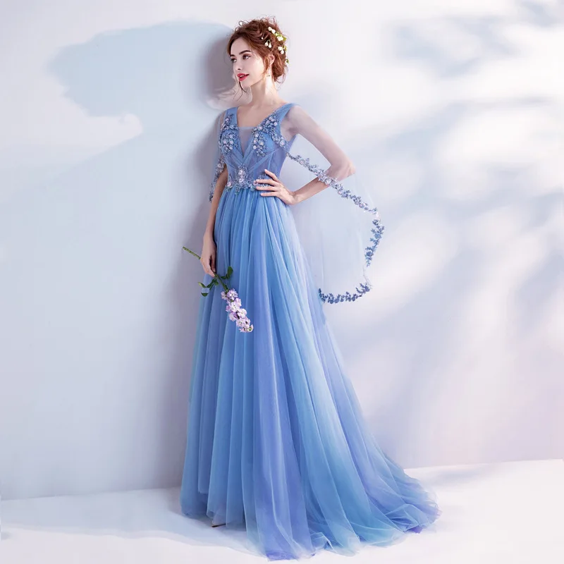 Limited 2019 New Young Mother Blue Long Dark V Flower Sexy Cute Ankle-length Lace Dress