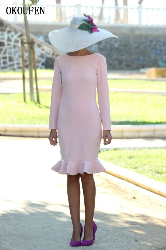 Promo Simple Mother of the Bride Dresses 2019 Knee Length Long Sleeves Ruffle Sheath V-Back vestido de ma