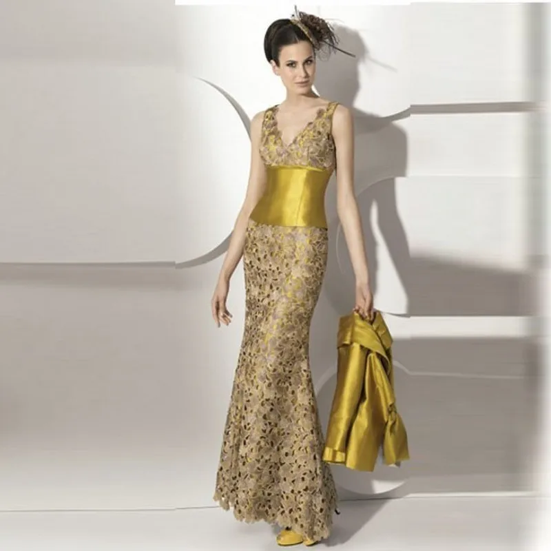 Get Gold 2019 Mother Of The Bride Dresses Mermaid V-neck With Jacket Lace Plus Size Groom Long Mother D