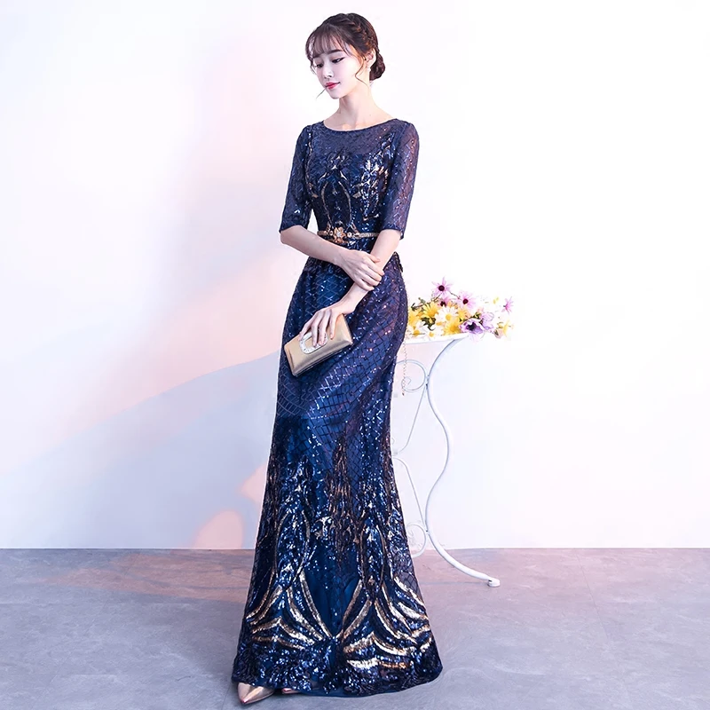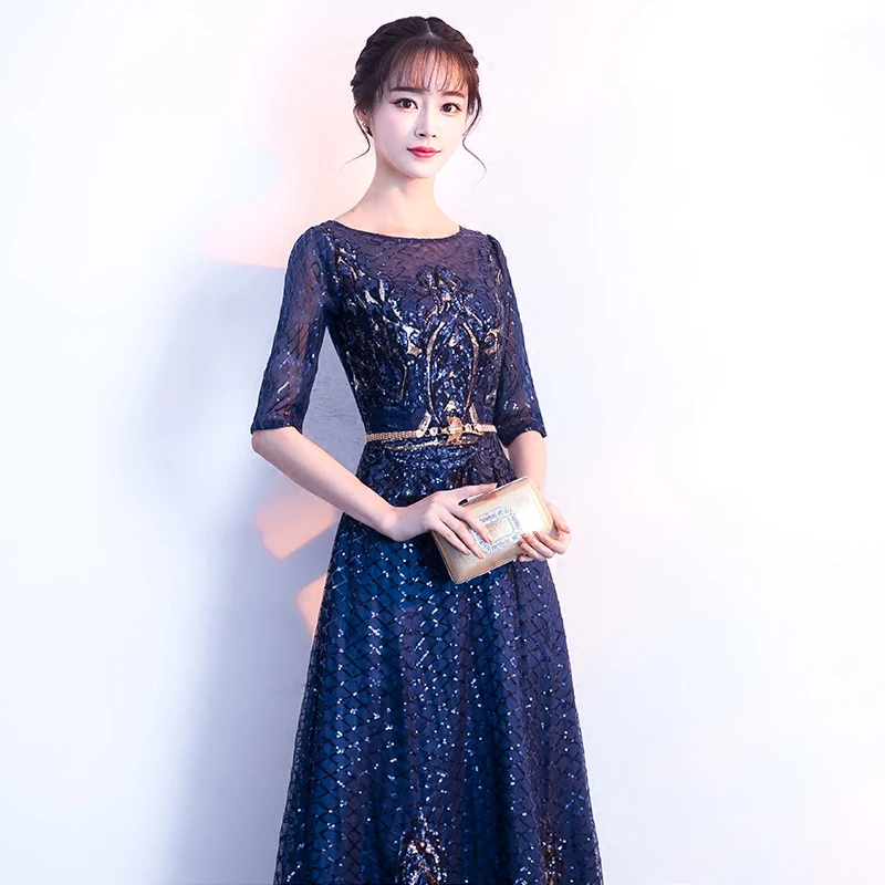 Special Product Navy Blue Long Evening Dresses 2018 With Sleeves Elegant O-neck A-line Floor-Length Sequined Mother
